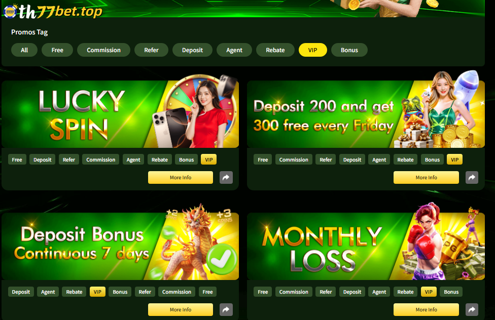 ในระบบ VIP ของเว็บพนันออนไลน์ th77bet สมาชิกจะได้รับสิทธิพิเศษมากมาย รวมถึงแคชแบ็กรายวันที่ให้คืนสูงสุดถึง 1.2% ขึ้นอยู่กับระดับของสมาชิก ซึ่งเป็นหนึ่งในข้อเสนอที่โดดเด่นและหายากในผู้ให้บริการหลายแห่ง